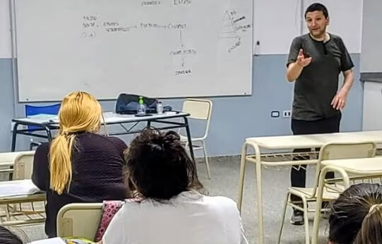 Ahora se desempeña como profe de Historia en cinco colegios de Río Segundo, Costa Sacate y Villa del Rosario, y se ganó de parte de sus colegas el apodo de “El Contento” porque no hay día que llegue a sus clases sin una sonrisa aunque tenga un día duro.