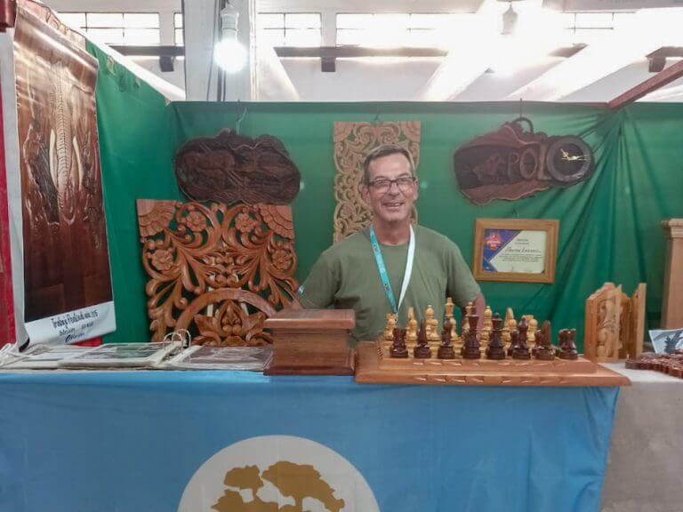 Técnico Químico de profesión, trabajó durante dos décadas en Arcor, pero “la madera siempre fue algo que me apasionó”, afirma mientras expone sus trabajos en la Feria Nacional de Artesanías de Arroyito.