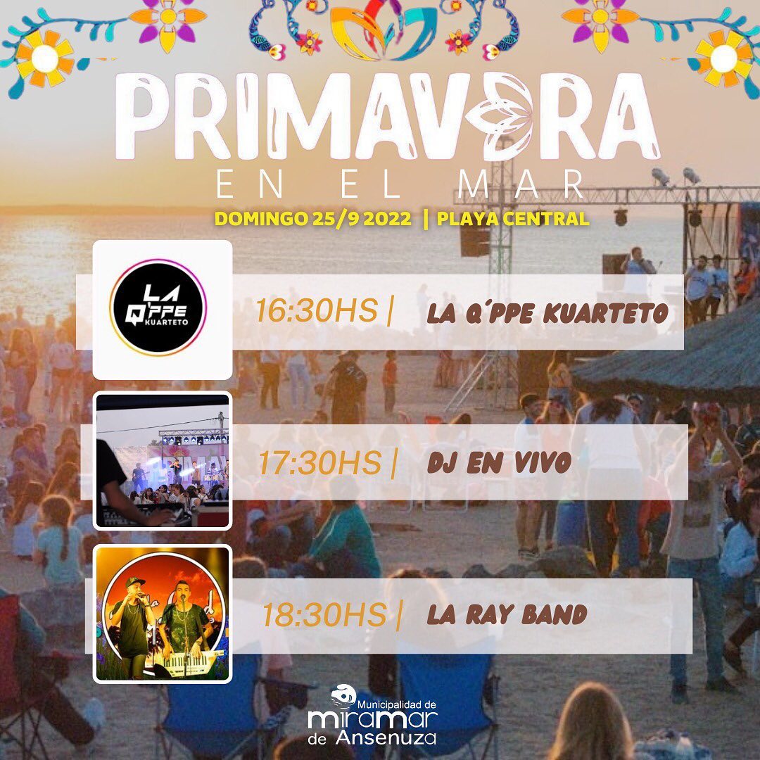 La llegada de la primavera se sigue festejando. Es así que a partir de las 16.30h, en la Playa Central de MIRAMAR DE ANSENUZA, se llevará a cabo “Primavera en el Mar”, evento que contará con la actuación de La Q´ppe Kuarteto, Dj´s, y el cierre con La Ray Band. La entrada es libre y gratuita.