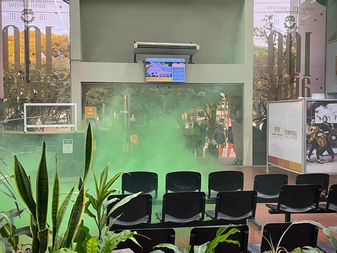 Los manifestantes arrojaron bombas de humo en la puerta del Municipio poniendo en riesgo a los trabajadores que se encontraban en sus puestos laborales y a los vecinos que hacían trámites. Fueron denunciadas penalmente las autoridades sindicales.